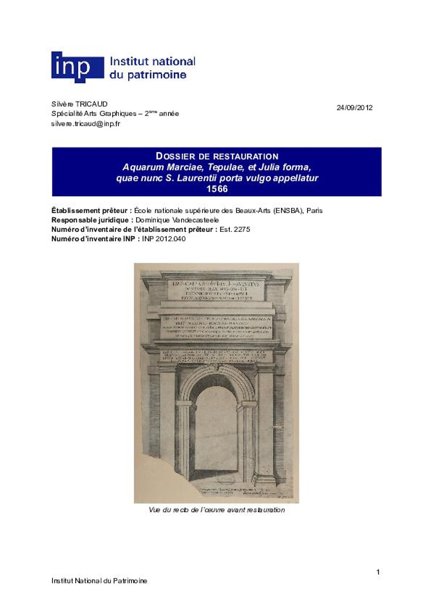 Dossier de restauration, Aquarum Marciae, Tepulae, et Julia forma, quae nunc S. Laurentii porta vulgo appellatur, 1566