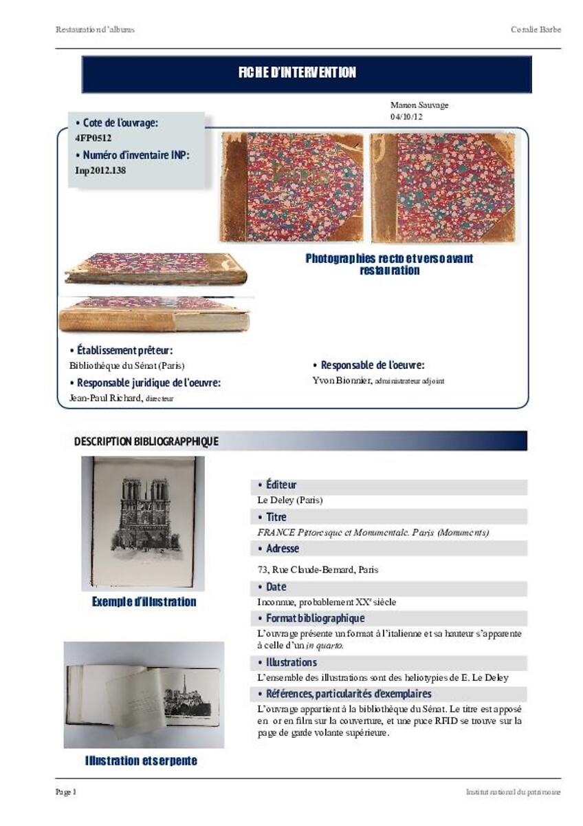 Fiche d'intervention (Album, FRANCE Pittoresque et Monumentale. Paris)