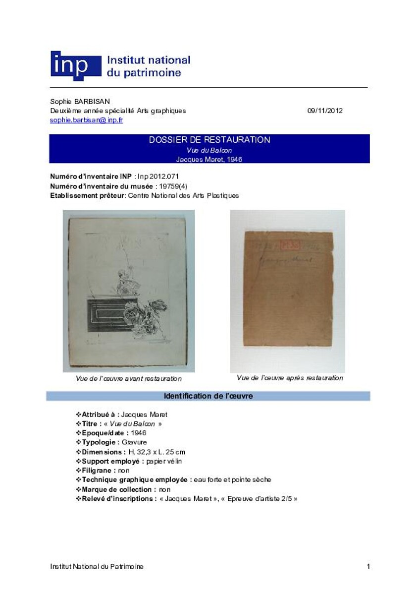 Dossier de restauration-Vue du balcon; Jacques Maret, 1946