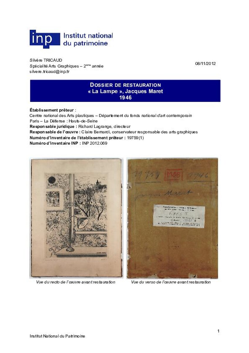 Dossier de restauration « La Lampe », Jacques Maret, 1946