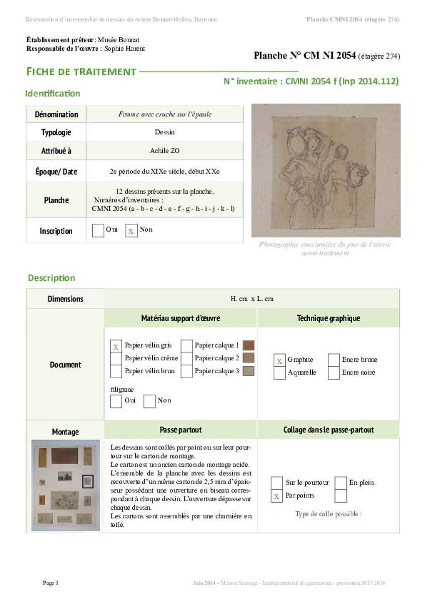 Fiche de traitement (Femme avec cruche sur l'épaule, dessin attribué à Achile ZO )