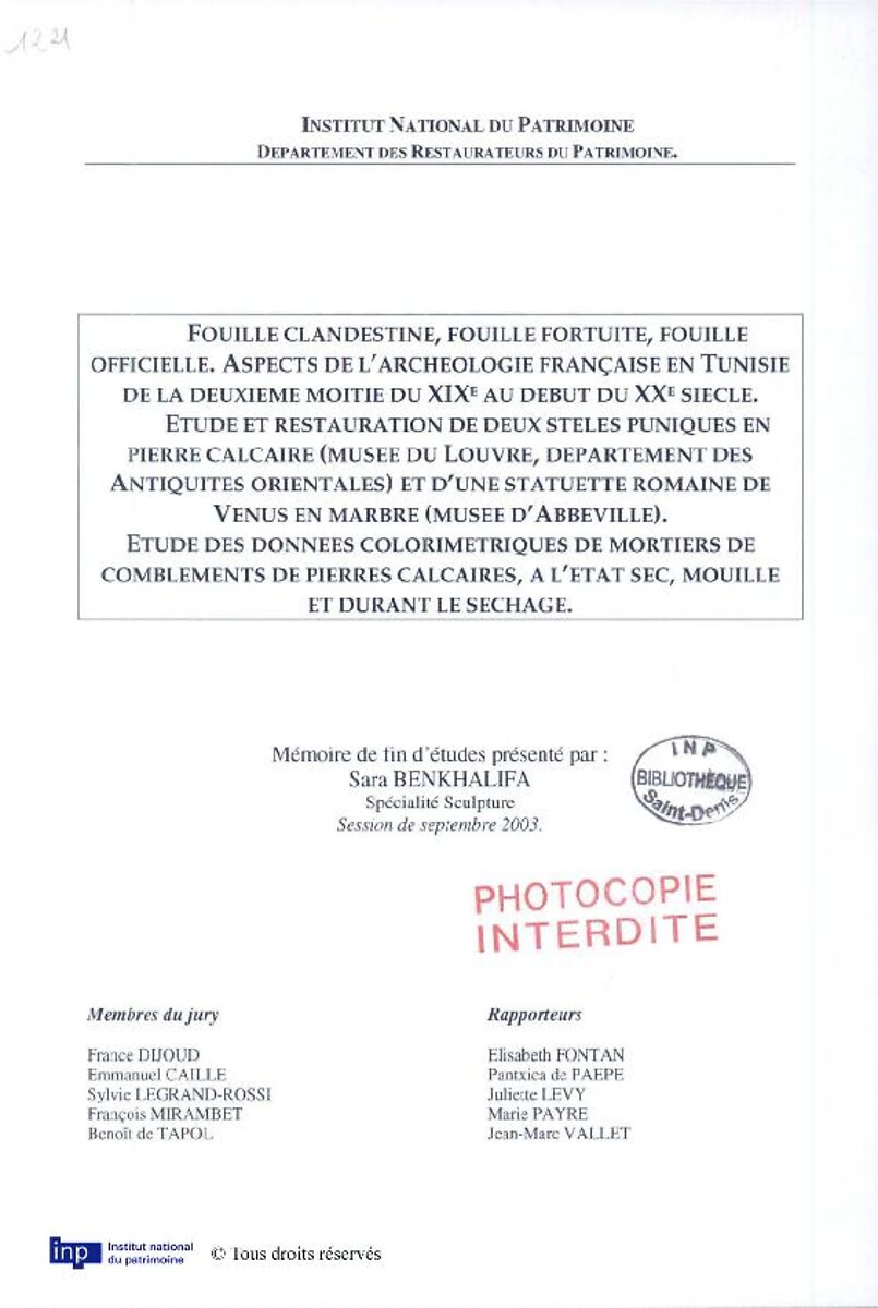 Fouille clandestine, fouille fortuite, fouille officielle : aspects de l'archéologie française en Tunisie dans la deuxième moitié du XIXe siècle au début du XXe siècle. Etude et restauration de deux stèles puniques en pierre calcaire (Musée du Louvre, dé…