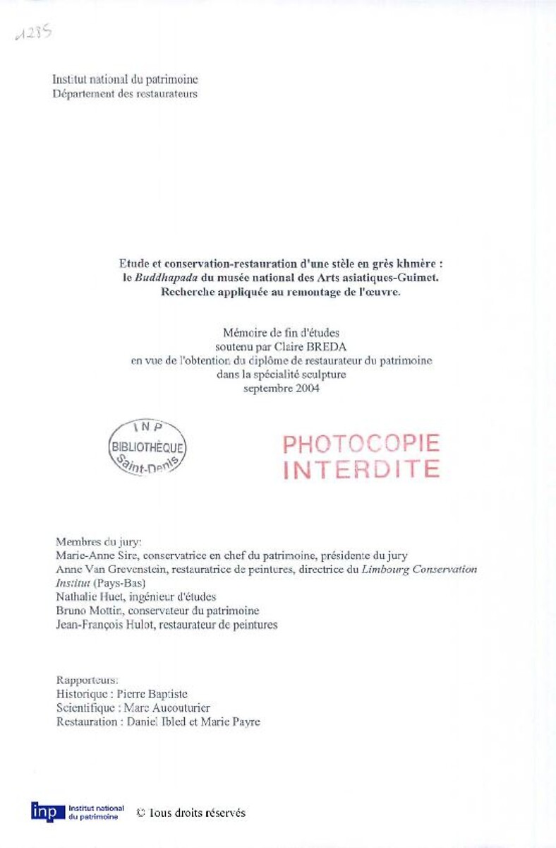 Etude et conservation-restauration d'une stèle en grès khmère : le Buddhapada du Musée national des arts asiatiques Guimet : recherche appliquée au remontage de l'œuvre