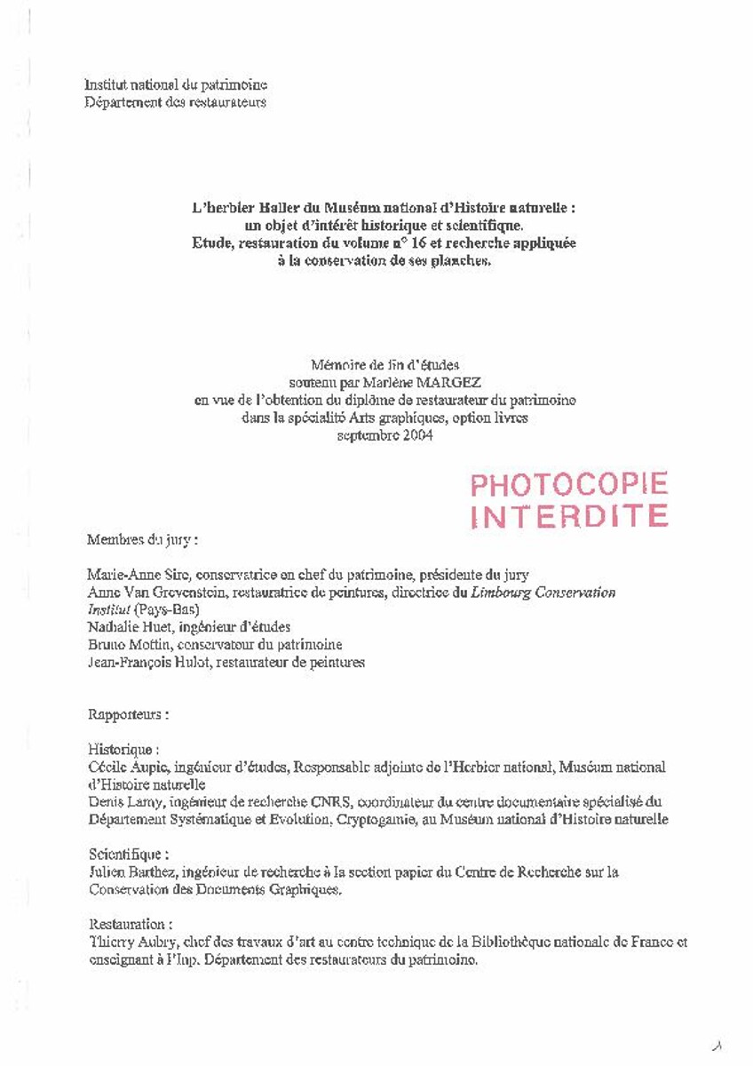 L'herbier Haller du Muséum d'histoire naturelle : un objet d'intérêt historique et scientifique : étude, restauration du volume n° 16 et recherche d'un papier adapté à la conservation de ses planches