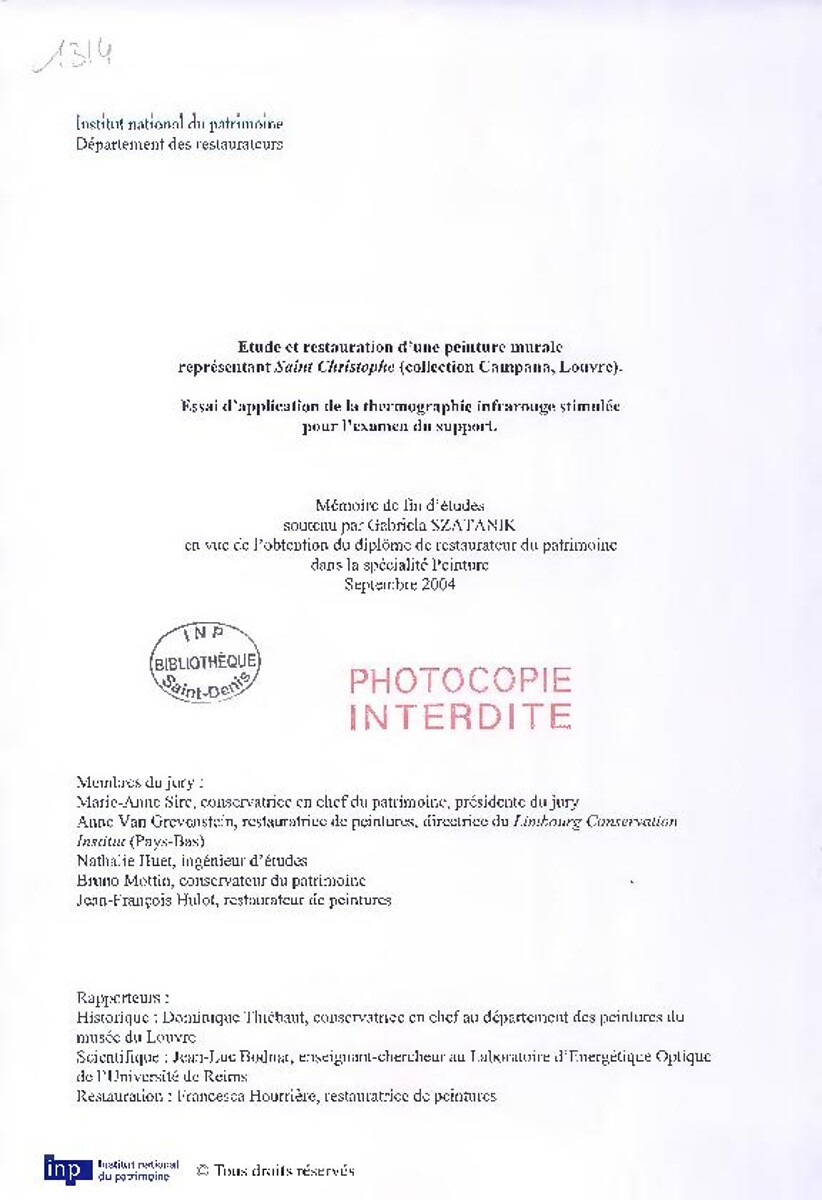 Etude et conservation-restauration d'une peinture murale représentant saint Christophe (collection Campana, Louvre) : essai d'application de la thermographie stimulée pour l'examen du support