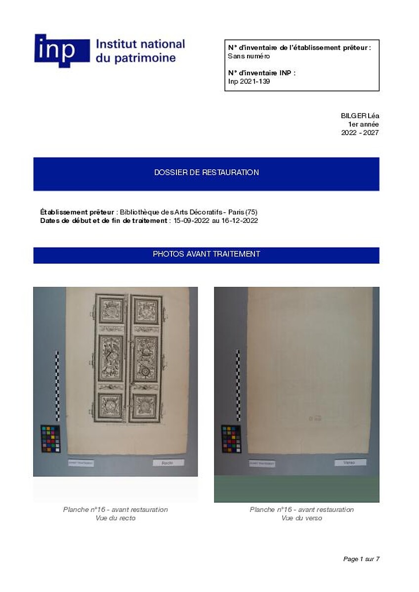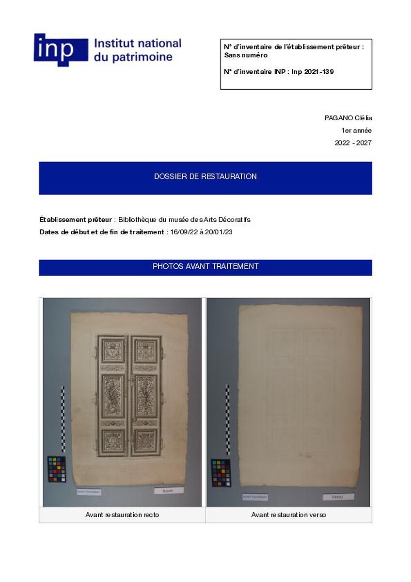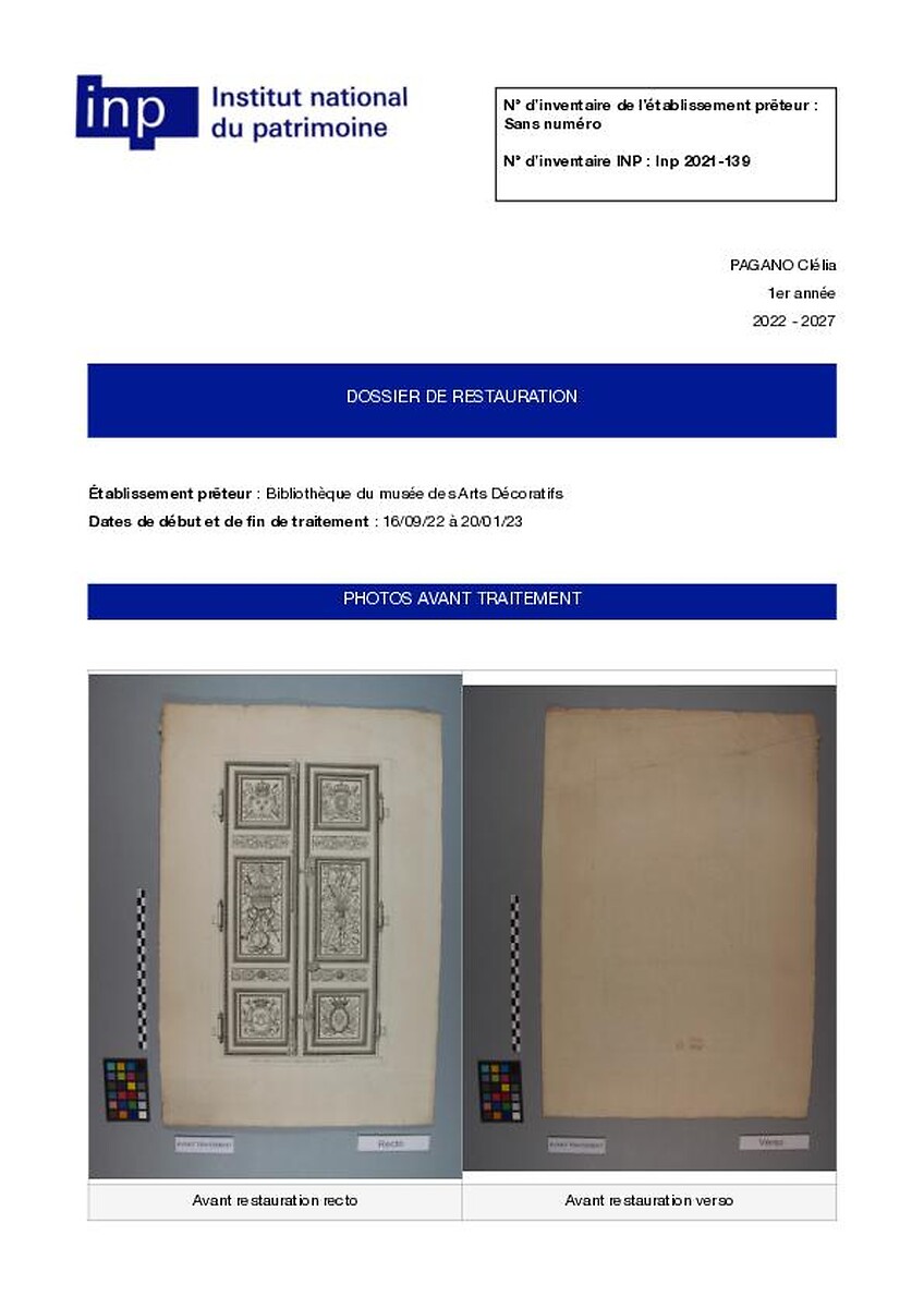 Dossier de restauration : Dessus de porte, 44e cahier, n°2 Porte dans le grand appartement des Tuileries (pl. 16 et 21)