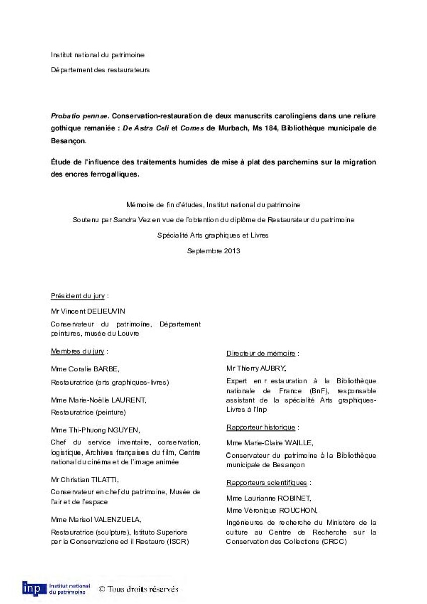 Probatio Pennae. Conservation-Restauration de deux manuscrits carolingiens dans une reliure gothique remaniée : De Astra Celi et Comes de Murbach, Ms 184 (Bibliothèque municipale de Besançon) : mise en évidence de l'influence des traitements humides de m…
