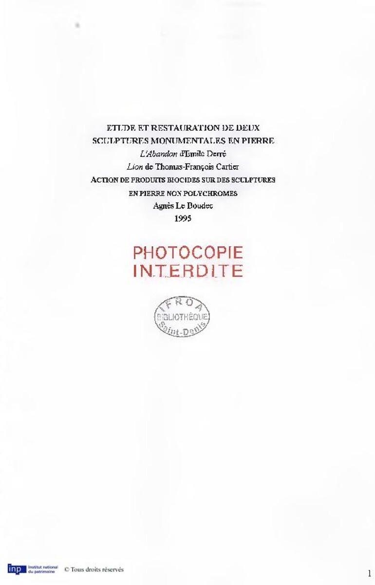 Etude et restauration de deux sculptures monumentales en pierre : "L'abandon" d'Emile Derré, "Lion" de Thomas-François Cartier : action de produits biocides sur des sculptures en pierre non polychromes