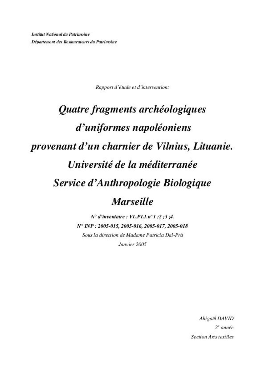 Rapport d'étude et d'intervention Quatre fragments archéologiques d'uniformes napoléoniens ,Vilnius (Lituanie)